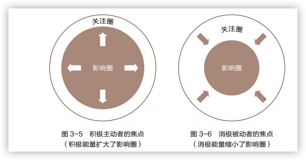 这一章最重要的概念就是提出来两个圈,关注圈和影响圈,顾名思义,我们每天都会关注很多事情,如果关注的事情可以被我们掌握,比如工作中分配的任务,锻炼身体等属于这一类,那么就说明这部分事情在影响圈内,其余的则不能被掌握,比如股票,战争等等,这些事情可能不能被我们所左右。
