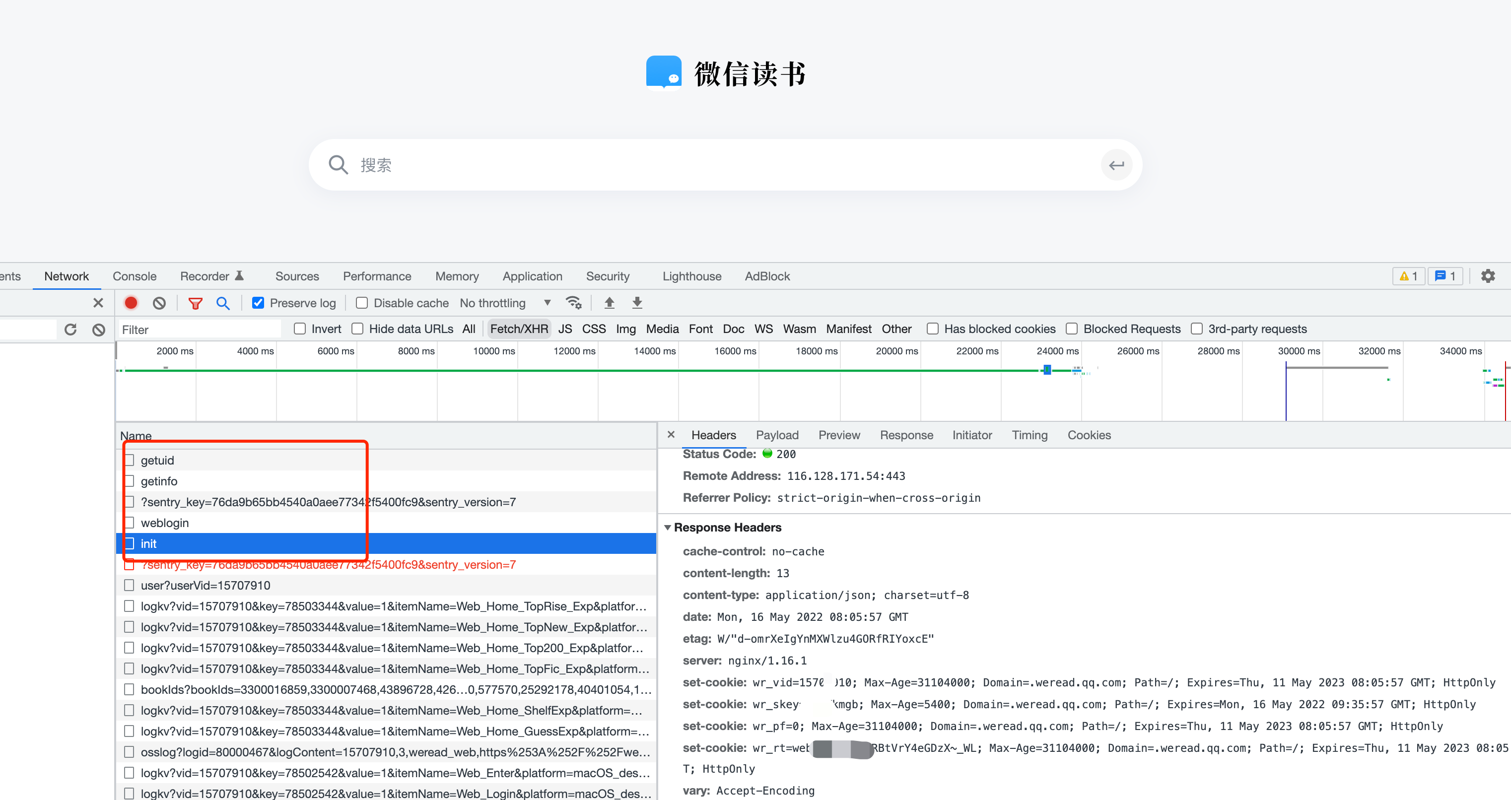 - session初始化,https://weread.qq.com/web/login/session/init,根据登录的信息初始化session,然就返回4个httpOnly的cookie信息,httpOnly的cookie信息不能通过`document.cookie` 这个也解释了之前在console中获取的cookie无法正常使用的问题。可以看到