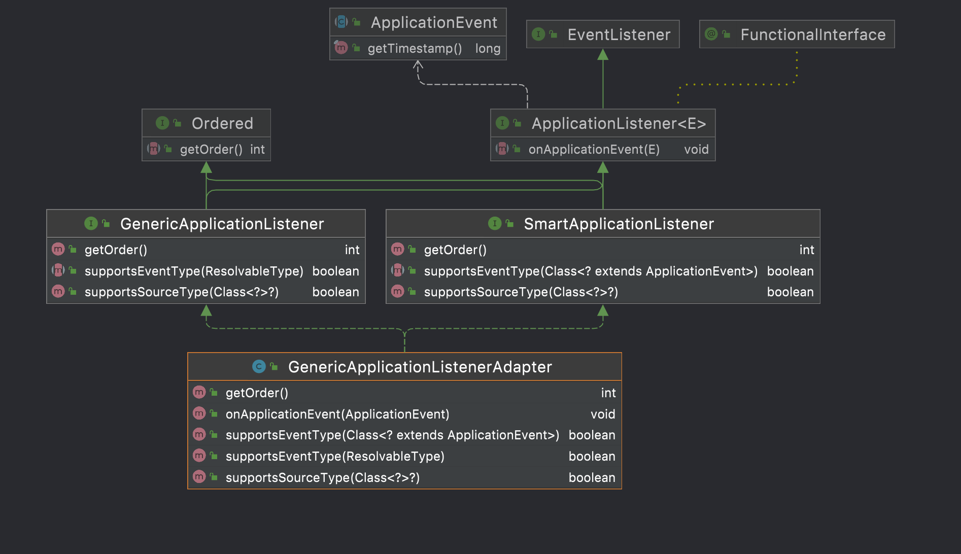 可以看出SmartApplicationListener和GenericApplicationListener是高度相似的,都提供了事件类型检测和顺序机制,而后者是从Spring4.2加入的,Spring官方文档推荐使用后者代替前者。