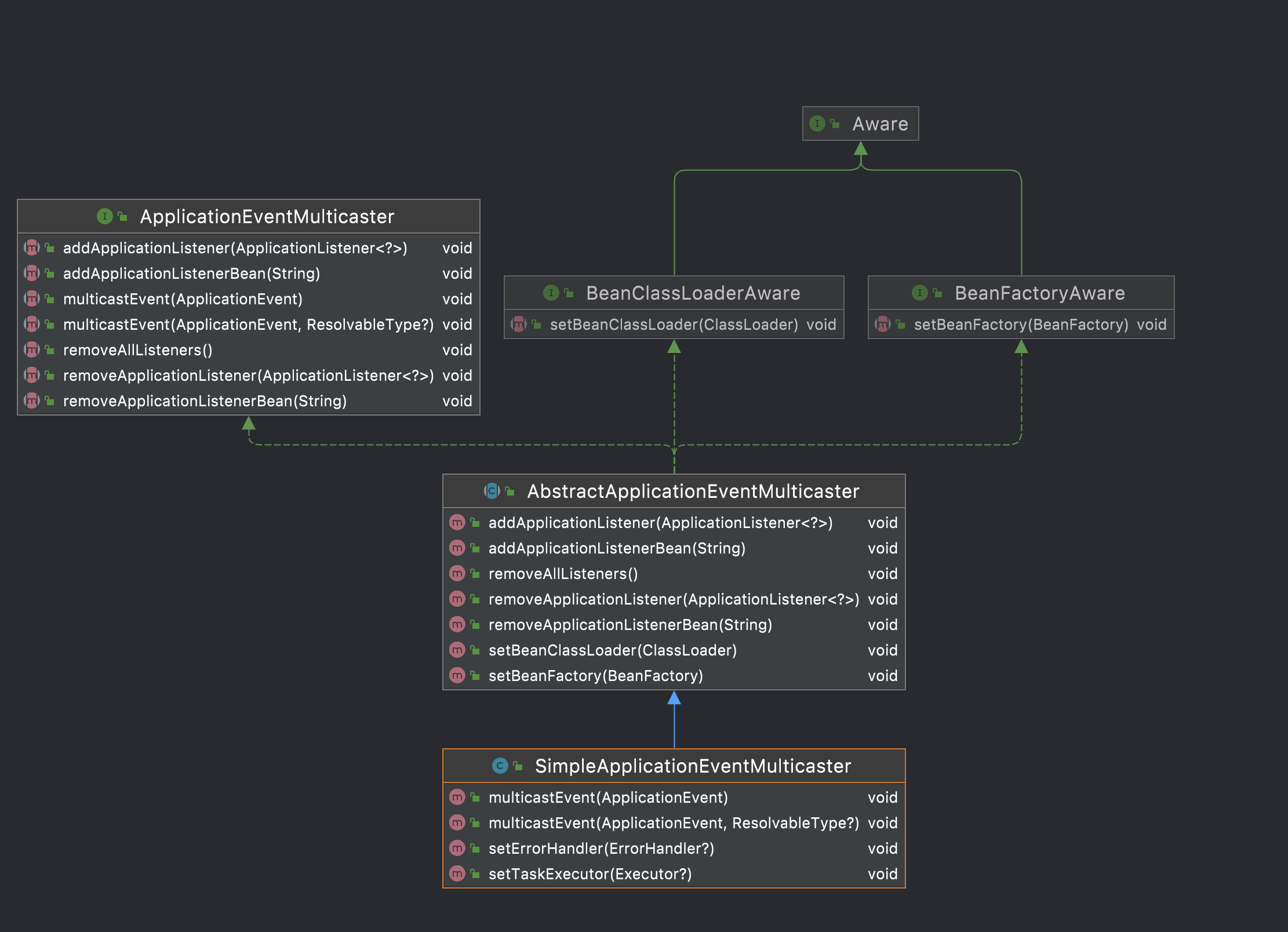 ApplicationEventPublisher实际上正是将请求委托给ApplicationEventMulticaster来实现的。其继承体系: