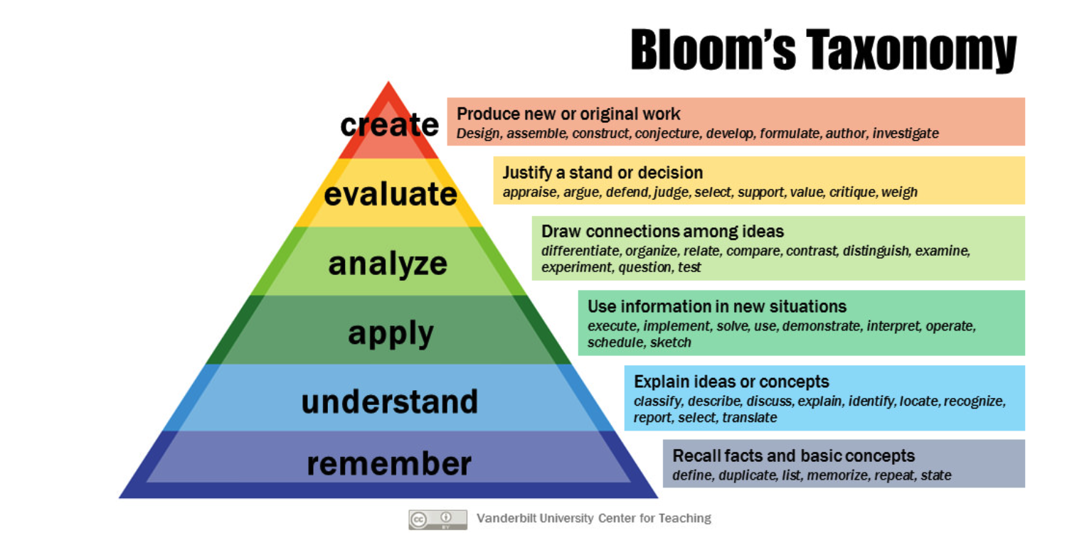 布卢姆分类学 (Bloom’s taxonomy) 是美国教育心理学家本杰明·布鲁姆于1956年在芝加哥大学所提出的分类法,此方法将认知层次分为六个,从低到高依次是:记忆(Remember)、理解(Understand)、应用(Apply)、分析(Analyze)、评估(Evaluate)、创造(Create)。