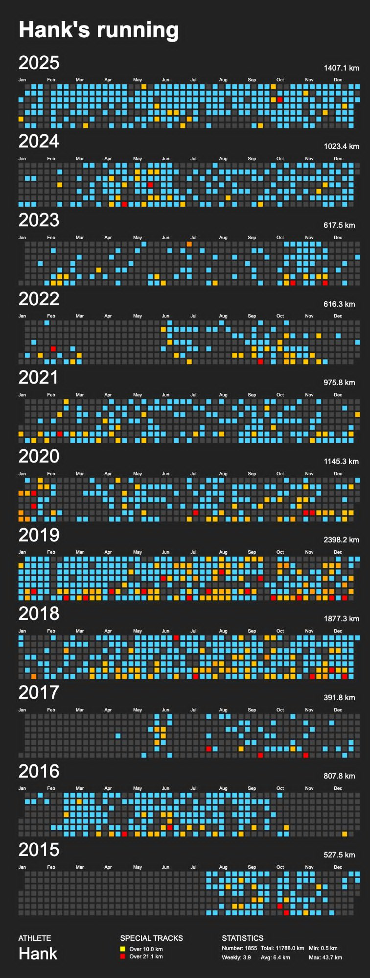 今年是我开始持续跑步 12 年了,今年跑步确实比较多,因为一些天气不好的时候,我也会在公司的健身房跑步,因此虽然每次基本上都是 5 公里,但是频率保持的,所以今年还是跑了有 1400km。